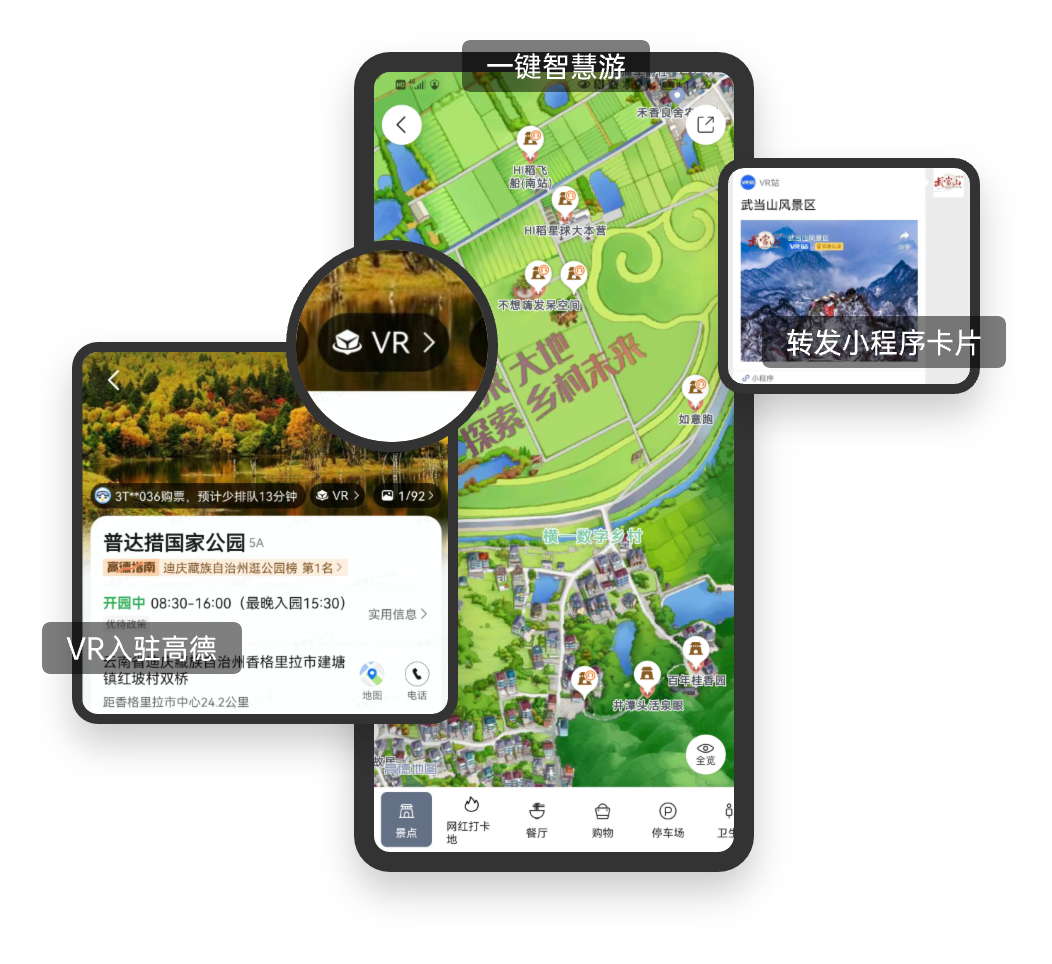 已打通各大流量平台,可接入微信/抖音/快手小程序,充分触达消费者,专项对接高德全域旅游服务“一键智慧游”、“景区途中播”等。